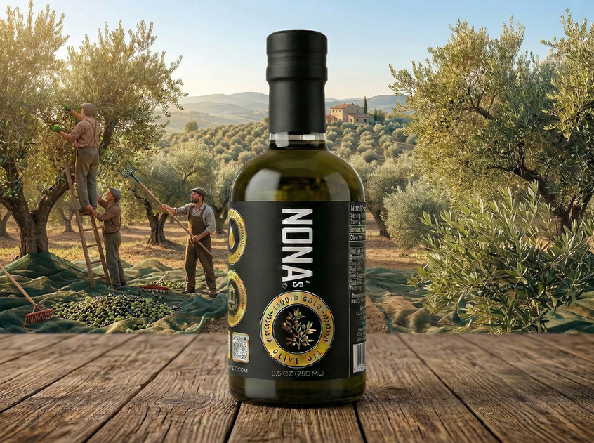 NONA's Ultra Premium Greek EVOO | Low Acidity Extra Virgin Olive Oil. Smooth Flavor. Terrific for Cooking Everything. This Ultra EVOO is an aromatic must have to any dish. Fresh Pressed from Olive Grove to your Home. Discover the Epicurean Delight. Family Reserve | Ultra Small Batches | Air Cargo in From Olive Grove to Your Table. Non-Commercial Olive Oil. Taste the Difference NONA's Makes.